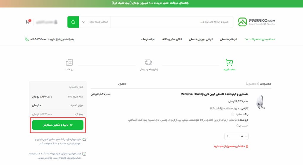 10. حال به صفحه مشاهده سبد خرید منتقل میشوید که در صورتی که مورد تایید شماست باید روی دکمه “تایید و تکمیل سفارش” ضربه بزنید.
