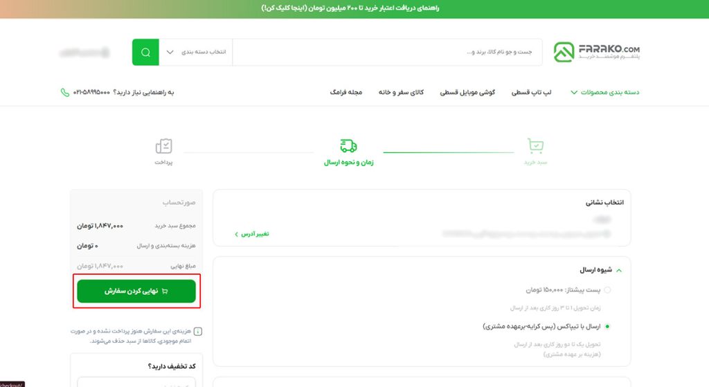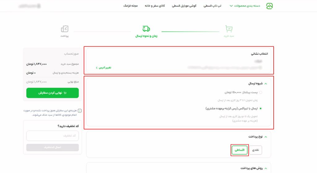 11. در این مرحله باید ابتدا آدرس محل تحویل سفارش خود را بهطور دقیق وارد کنید؛ سپس نوع و روش ارسال را انتخاب کنید تا طبق آن هزینه ارسال مشخص شود و بتوانید مبلغ نهایی فاکتور خود را مشاهده کنید. در انتها نیز باید نوع پرداخت خود را روی حالت “اقساطی” قرار دهید.