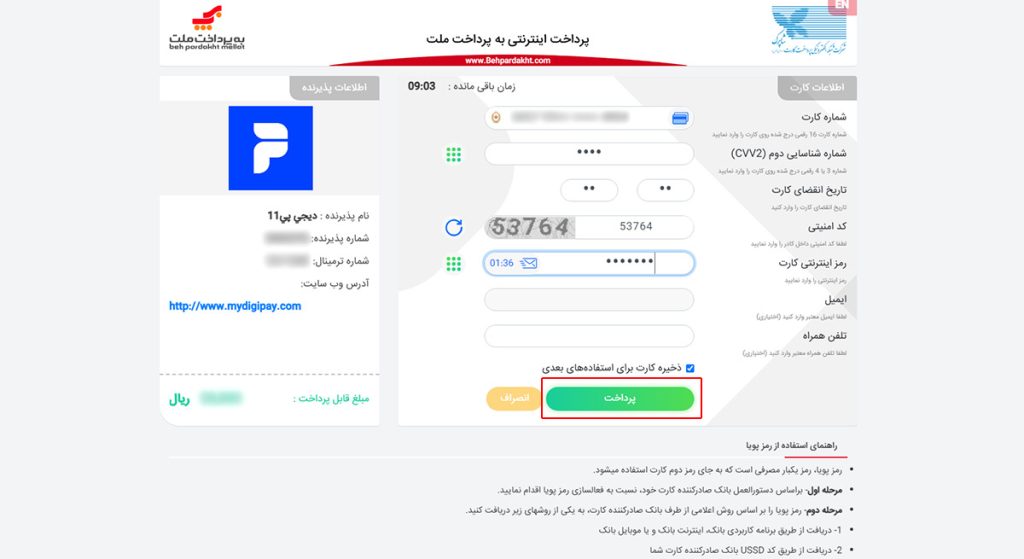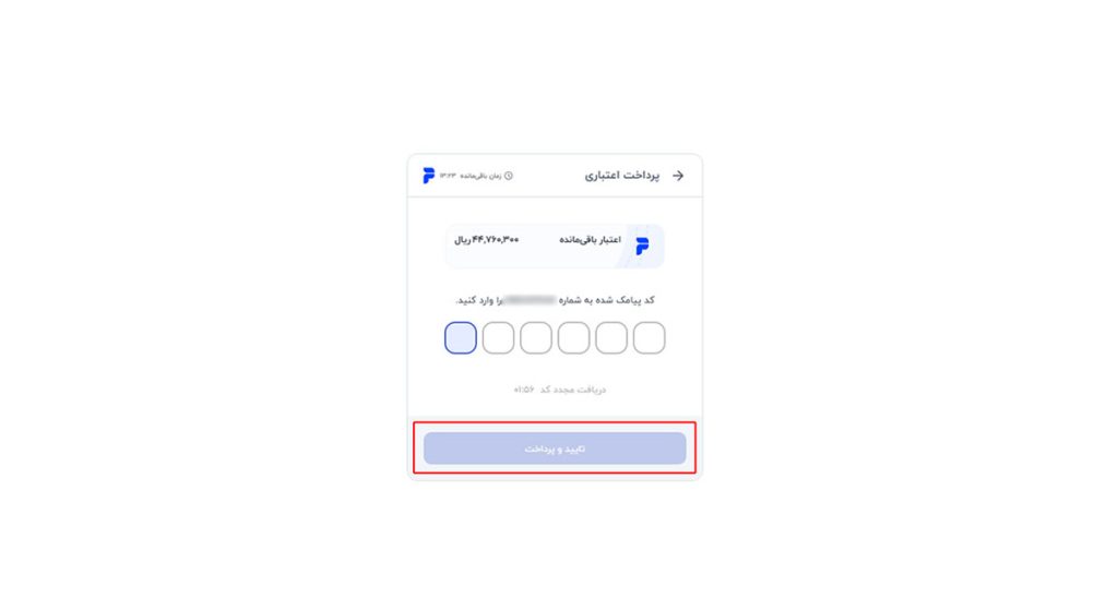 15. در این مرحله کد به شماره تلفن حساب دیجی پی شما ارسال میشود که باید آن را وارد کرده و دکمه تایید و پردخت را لمس کنید.