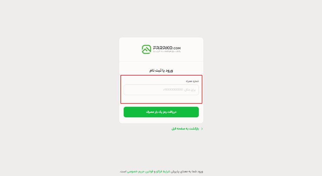 2. در صورتی که پیشتر حساب کاربری ساخته باشید، شماره همراه خود را در کادر مربوطه وارد کنید.