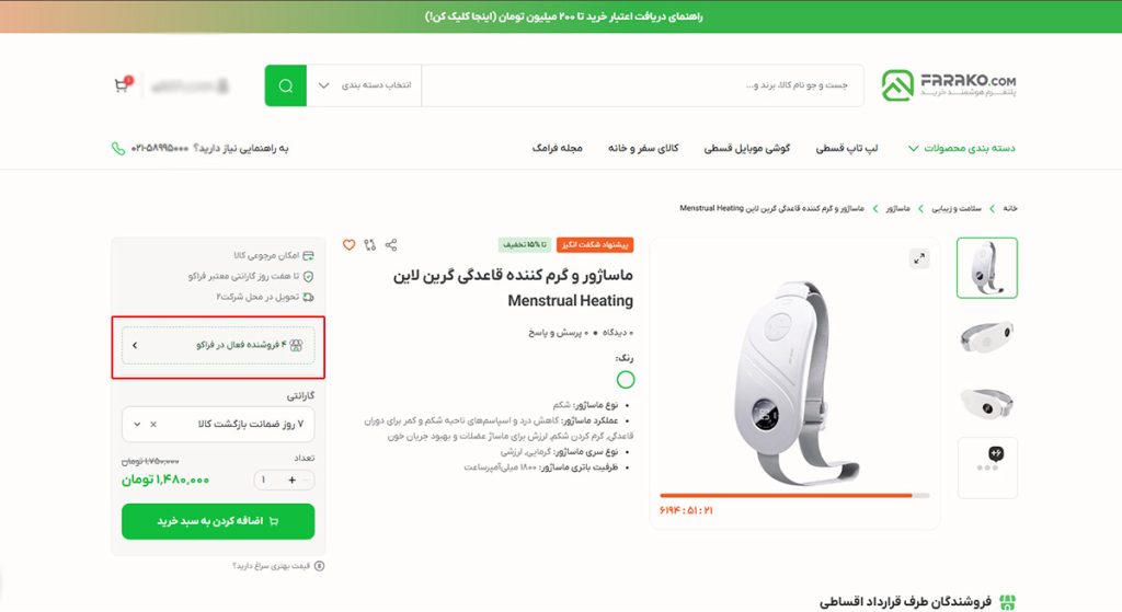 5. در صفحه محصول، کمی پایینتر از اطلاعات کلی کالا، به قسمت فروشندههای مختلف میرسید؛ البته برای دسترسی سریعتر میتوانید روی فروشنده فعال در فراکو ضربه بزنید تا مستقیم به آن برسید.