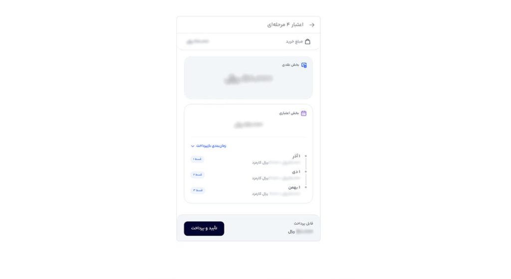 16. در صفحه پیش رو، تمامی اطلاعات لازم مانند مبلغ کلی کالا، قسطی که باید در حال حاضر بپردازید و قسطهای ماههای آینده به همراه سود، نمایش داده می شوند که اگر مورد تاییدتان است روی گزینه تایید و پرداخت بزنید.