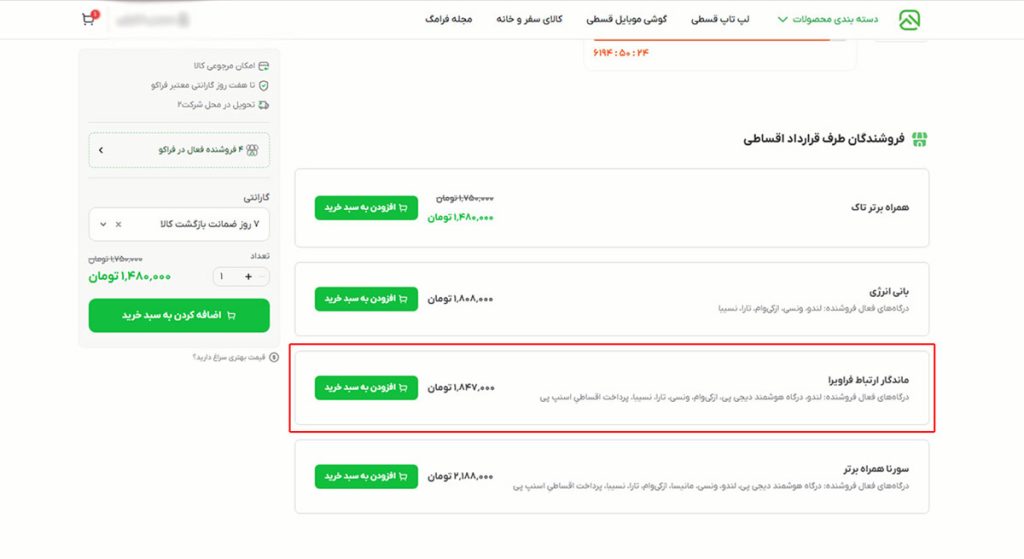 6. در قسمت فروشندگان طرف قرداد اقساطی فراکو، با ۴ فروشنده فعال مواجه میشوید که باید “ماندگار ارتباط فراویرا” را به سبد خرید خود اضافه کنید.