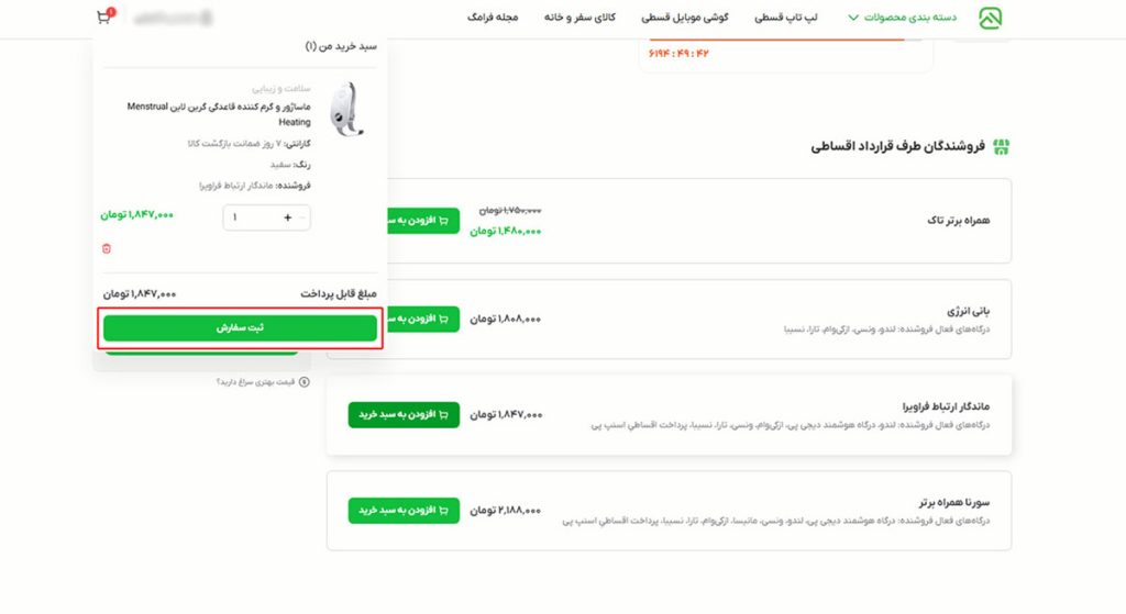 7. در ادامه این فرایند، پنجرهای از سبد خرید شما باز میشود که برای نهایی کردن خرید خود باید روی گزینه “ثبت سفارش” کلیک کنید.