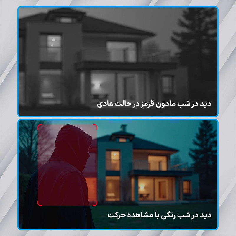 | قابلیتهای دوربین امنیتی و نظارتی | قابلیت چرخش Tilt, قابلیت چرخش Pan, قابلیت بزرگنمایی دیجیتال, دید در شب, قابلیت ضبط صدا, شیار کارت حافظه, قابلیت اتصال به گوشی, قابلیت تشخیص انسان, قابلیت مکالمه دو طرفه, دارای محفظه کارت حافظه, دارای سنسورهای حرکتی, ضدآب |