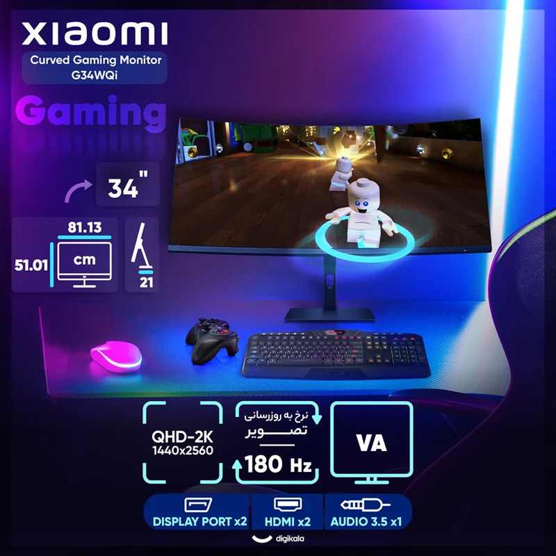 مانیتور Xiaomi Monitor G34WQii با بهرهگیری از پنل خمیده ۳۴ اینچی فوق عریض و رزولوشن ۳۴۴۰×۱۴۴۰، تجربهای فراگیر و دقیق از نمایش محتوا ارائه میدهد. نرخ نوسازی ۱۶۵ هرتز و زمان پاسخگویی ۱ میلیثانیه در کنار پشتیبانی از فناوری AMD FreeSync Premium، این مدل را به گزینهای ایدهآل برای کاربران حرفهای و علاقهمندان به بازیهای سریع و روان تبدیل کرده است. پشتیبانی از استاندارد HDR موجب افزایش دقت نمایش جزئیات در صحنههای تیره و روشن میشود، در حالی که پوشش رنگی گسترده شامل ۱۲۱٪ فضای رنگی sRGB و ۸۵٪ NTSC، آن را برای طراحی و تولید محتوای بصری نیز مناسب ساخته است. طراحی سهطرف بدون حاشیه همراه با پایه قابل تنظیم در ارتفاع، شیب و زاویه چرخش، امکان تطبیق مانیتور با وضعیت کاربر را فراهم میسازد. در بخش اتصالات، این مانیتور به دو پورت HDMI 2.0، دو پورت DisplayPort 1.4 و یک خروجی هدفون مجهز است. همچنین فناوریهای کاهش نور آبی و حذف لرزش تصویر، به حفظ سلامت بینایی در استفاده طولانیمدت کمک میکنند. Xiaomi G34WQii ترکیبی از کیفیت تصویر، عملکرد فنی و طراحی کارآمد را در قالب یک نمایشگر حرفهای گرد هم آورده است.